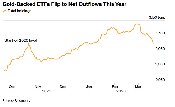 这种贵金属——通常被视为避险资产——自上个月美国和以色列对伊朗发动袭击以来,已连续数周下跌。金价走弱之际,美国国债收益率和美元走强,投资者抛售黄金以弥补其他资产的损失,同时黄金支持的交易所交易基金(ETF)出现资金流出,全球持仓已抹去年初以来的全部增量。